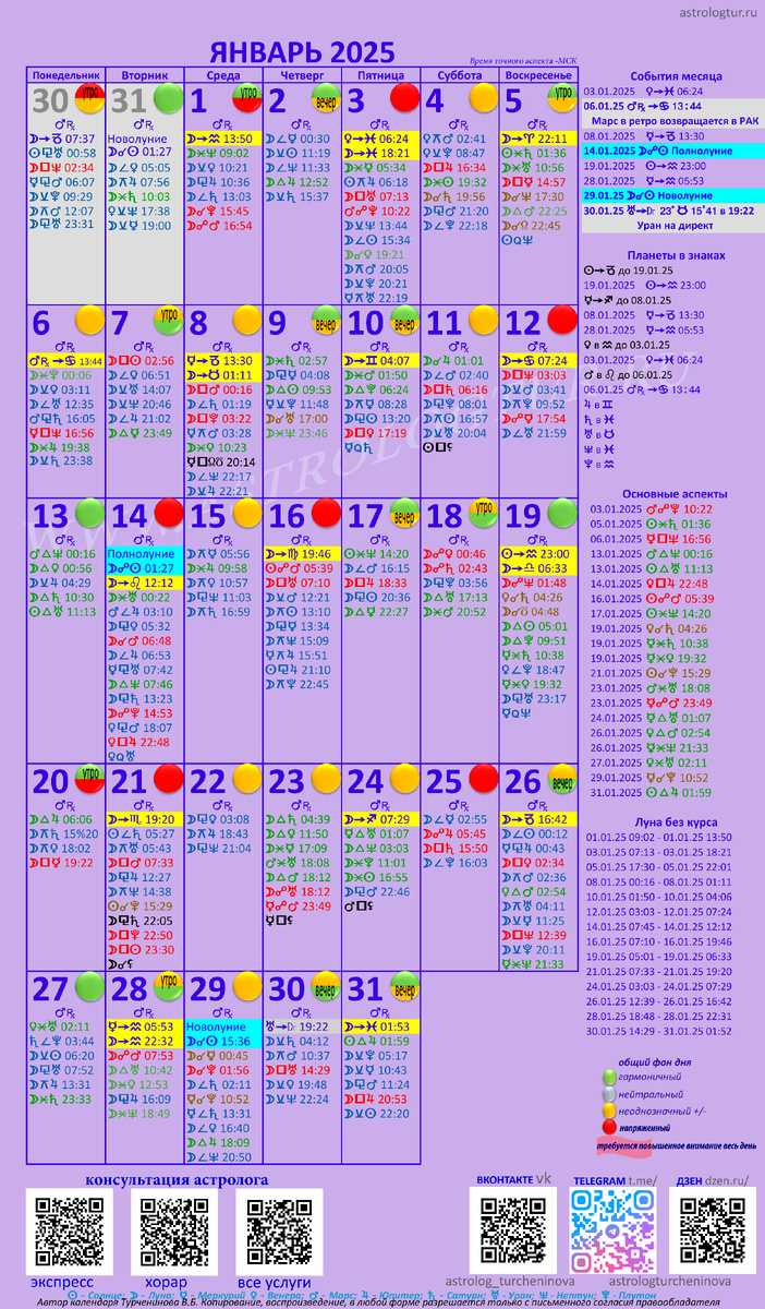 Год Змеи символизирует мудрость, интуицию и глубокое понимание жизни. 🐍 Змея учит нас быть внимательными к деталям и принимать обдуманные решения. В преддверии этого волшебного праздника я с радостью хочу сделать вам подарок — Астрологический календарь на январь 2025 года! 📅💖 С помощью этого календаря вы получите доступ к знаниям, которые помогут вам ориентироваться в каждом дне нового года. 🌌 Пользоваться календарем очень просто! Он удобен как для тех, кто совсем не знаком с астрологией и не хочет вникать в сложные термины, так и для тех, кто хочет знать о каждом дне месяца более подробно. В астрологическом календаре каждый день помечен определенным цветом, показывающим его общий фон — благоприятный или напряженный. Это позволит вам совершать мудрые шаги и избегать опрометчивых решений, соответствуя символике Года Змеи. 🐍💫 Просто смотрите, какого цвета кружочек, и делайте вывод об этом дне. Для тех, кто хочет знать больше о нюансах и временных промежутках влияния аспектов в опре