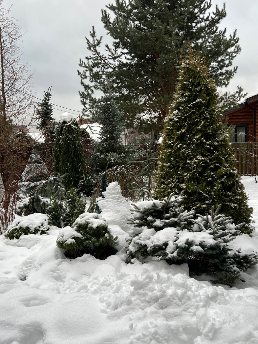 Решили встречать Новый год за городом, на даче, тем более дети приедут в гости. Сад спит, снега не много, но есть . Больше беспокоит ледяная корка, наст. Тяжелый снег из-за температурных качелей, но отряхивать нечего, сам в оттепель растаял. Каждую зиму от пихт остаются видны только иакушки из под снега, а иногда и они не видны даже Вейгела не укрытая полностью, как обычно, попала под -22 градуса. Всегда под снегом зимовала и цвела каждое лето, ну посмотрим Туи цвет поменяли, бурые становятся зимой, спящие)) А в лесу елки четкл аиднь, пока листьев нет Ну стала трогать вмерзшие в снег макушки и ветки елок, скованы льдом, легко повредить Поэтому и стригу покороче штамбы Ивы и лиственниц, чтобы не тянул лед вмерзшие ветки Накидала снежку на корни гортензии, а то под навесом мало наметает Ель Изели Фастигиату буду стричь кардинально в следующем сезоне, пока снег не доломал ветки, которые растут у нее вверх. Связать уже возможно, высокая Ну а я готовлюсь к встрече Нового года. Очень лю