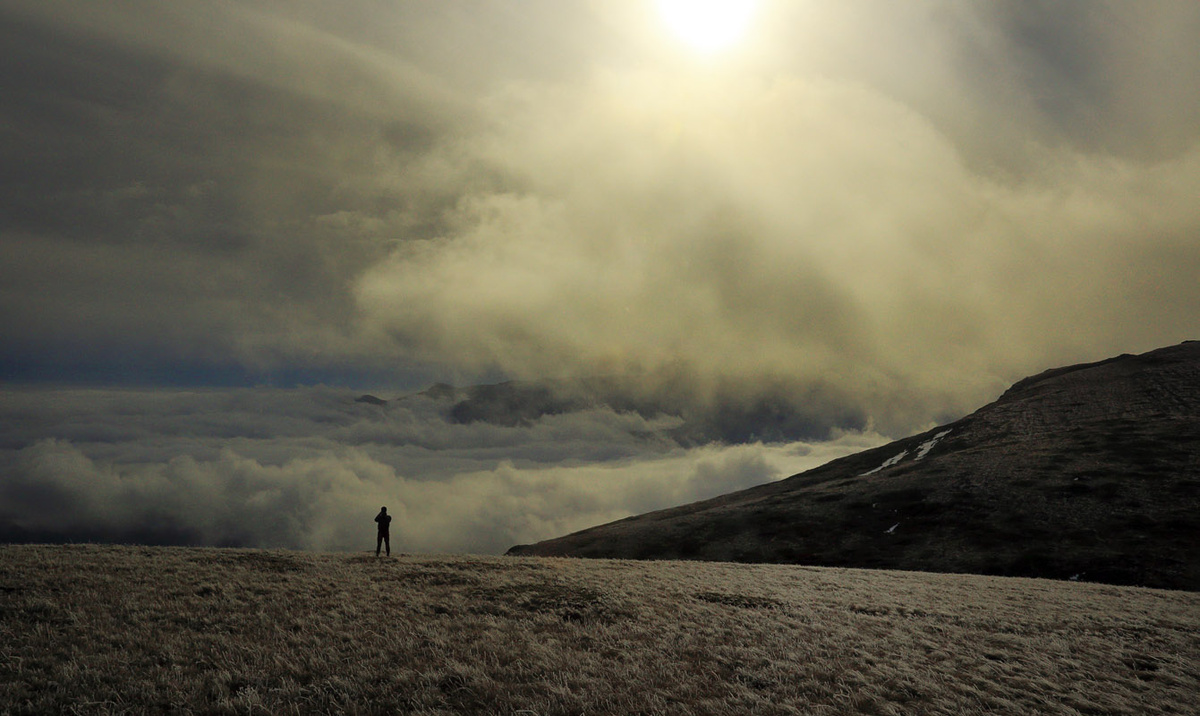 Горный сезон 2015, впрочем не только горный сезон, был весьма удачен. Летом я вывез своих студентов в Архыз, где мы прошли 6 перевалов, побывали у красивых озер. Ребята открыли для себя Кавказ. Правда, закрывать мы сезон собрались только вчетвером: мой коллега по университету и путешествиям Виктор Бутрим с дочкой Аней, студент (тогда еще) математик Кирилл Самсонов и я. Виноват, впятером и Найк. Поднимались на верхнее плато Чатыр-Дага по традиционному маршруту - вверх по крутой тропе к Ангар-Бурун. Погода была отнюдь не зимней, а поздно осенней. Собственно основная словесная информация о путешествии изложена практически в полном объеме. В отличии от фото информации, которой в это день набралось не мало. Утро было, практически в соответствии с романсом - туманным. Правда, туманным утро было до выхода из леса. Выше леса туман "превратился" в облака под ногами. Кстати, разница между туманом и облаками наблюдается в зависимости от Вашего положения. Если В, то это туман, а если НАД или