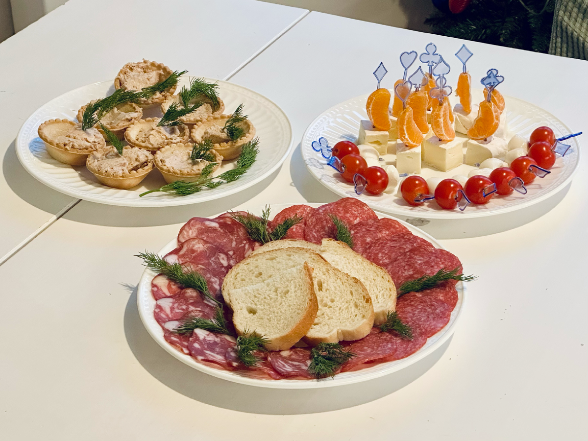 Вчера у нас был непростой день. Утром мы устроили предновогоднюю уборку, потом был тимохин дневной сон, а потом к нам сначала приехали в гости мои близкие, а потом тётя мужа. Все они хотели увидеться с Тимофеем и подарить ему новогодний подарок. И все они, конечно, уверили, что сказали, что стол накрывать не надо. Но как же без угощений? У нас так не принято! Хотя сил и времени готовить что-то глобальное не было, я решила, что просто бутерброды с чаем — это скучно, поэтому выкрутилась небольшими закусками, для которых ничего не надо готовить. Идею подглядела у автора блога «Сладкий персик». Как всё выглядело в финале, сфоткать не успела, поэтому расскажу и покажу те фотки, что есть (вот такой я недоблогер, ага :)). Что я заказала (господи, как же круто, когда есть доставка за 15 минут!): Какие закуски у нас были на столе: Ещё ставили на стол фрукты: у нас были мандарины, яблоко и виноград. И чай с тортиком был. На новогодний стол тоже планирую похожие закуски, но можно сделать чут