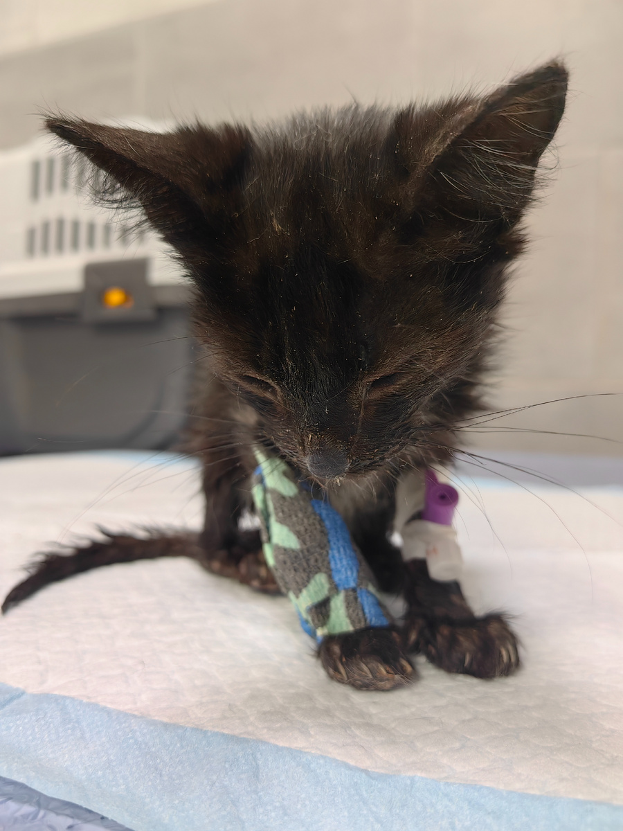Ездили к неврологу с этим мелким. История: позвонила женщина и попросила забрать семью из подъезда. Там жили кот, кошка и 3 котенка. Один котенок погиб - замерз на улице, потому что дверь в подъезд закрыли. На месте выяснилось, что это те немногие кошки, которые выжили после продолжительной болезни и смерти деда-собирателя. Многие умерли еще когда он лежал в больнице. Оставшихся после его смерти выставили на улицу. Кто-то убежал в соседние подвалы, а эти остались с своем подъезде. А еще оказалось что котенка 3. Замерзшего котенка умирающего женщина когда нашла занесла в подъезд и положила под батарею. И похоже он отогрелся. Сначала всё было неплохо. Котята если как не в себя. Но через сутки заехав вечером в приют я нашла одного из котят, того что помельче, еле живым. Он трясся, кричал, не давал до себя дотрагиваться. Положила его на грелку и он успокоился. А еще котенок не мог нормально ходить и падал на бок. Потом заметили что как будто не видит. Записали его к неврологу. Мы думаем