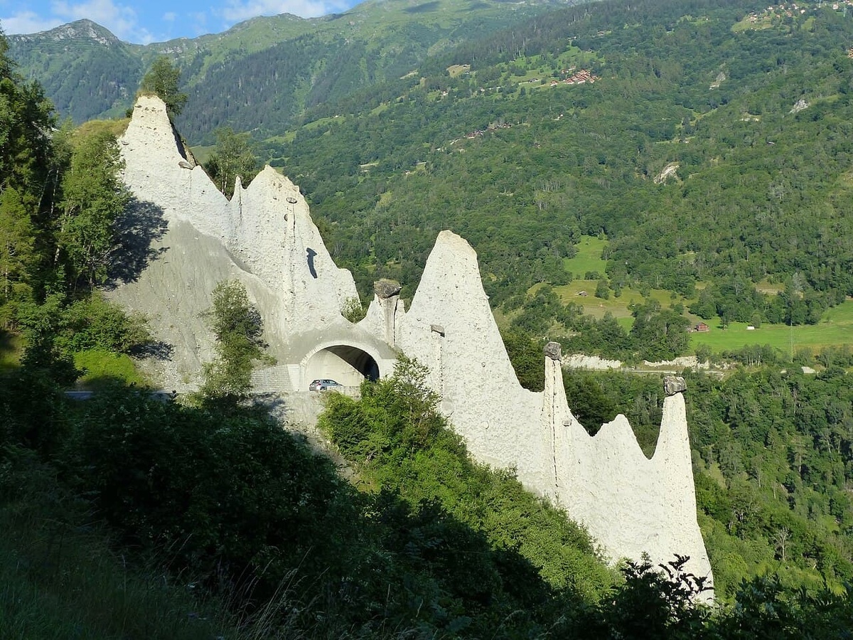 В швейцарском кантоне Вале, среди гор, покрытых лесами, можно встретить самые настоящие пирамиды. Они совершенно непохожи на окружающий ландшафт, и к их созданию человек не имеет никакого отношения. Конечно, тут виноваты не пришельцы, а древний ледник. Пирамиды Эсень (Euseigne) — это образования высотой от до 10 до 15 метров с каменными «шапочками» на вершинах. В нижней части "пирамид" находится более мягкая порода, которую называют «моренный бетон» — это смесь глины, песка и камней, которая уплотнилась под давлением льда. Когда ледник отступил, эта смесь постепенно приобрела такой вид в результате эрозии. Так что “пирамиды” — древняя граница ледника Эренс, который пришел в Швейцарские Альпы около 80 000 лет назад и отступил 10 000 лет назад. Камни на вершинах некоторых пирамид — ледниковые валуны из более прочной породы - например, из гнейса и серпентинита. Некоторые из них достигают веса в 20 тонн и, скорее всего, упадут в течение нескольких столетий, после чего пирамиды очень быстро