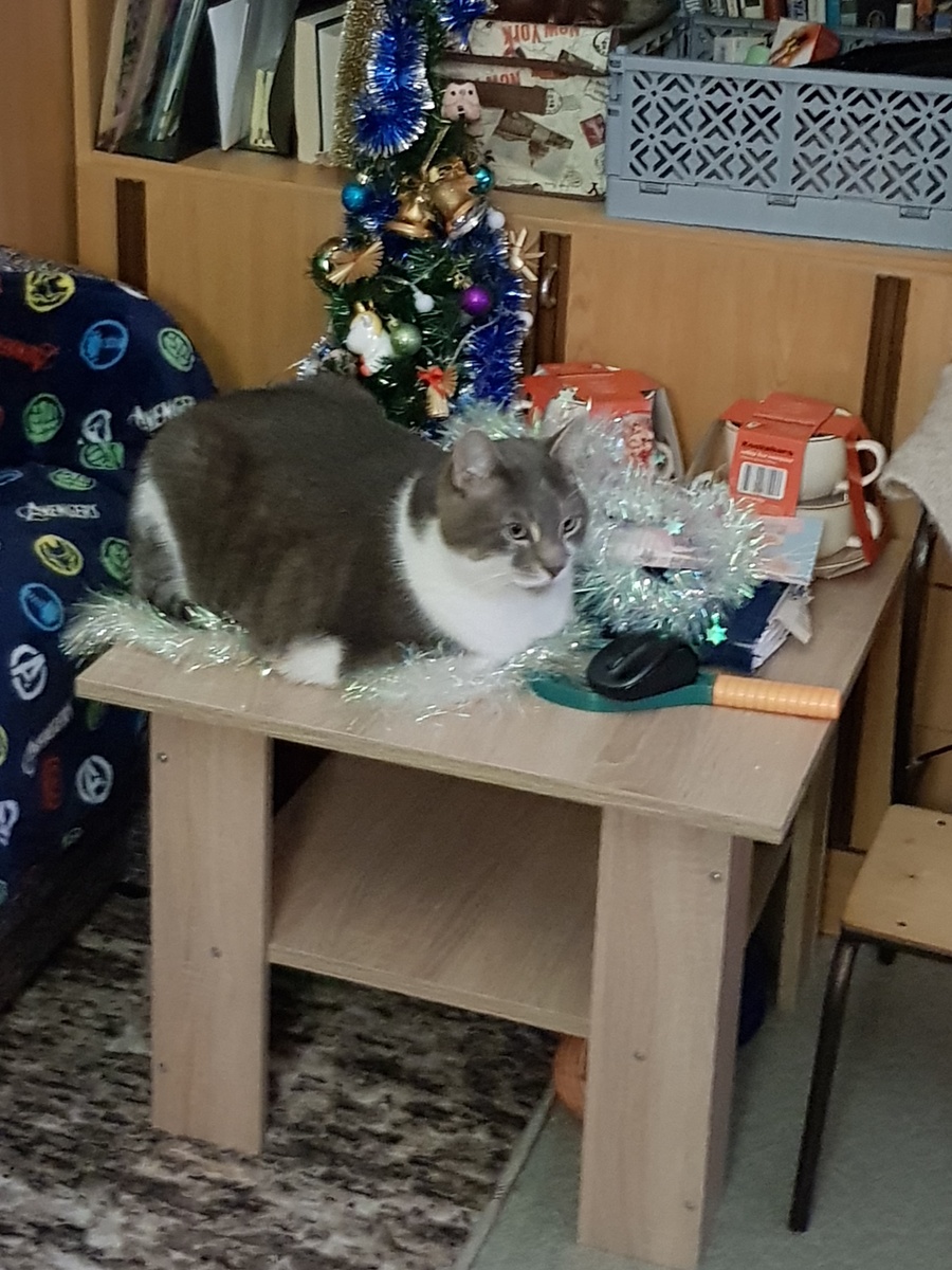 Сначала хотела оставить её на этом журнальном столике, но Тихон стал проявлять интерес. И на мишуре ему очень понравилось валяться.