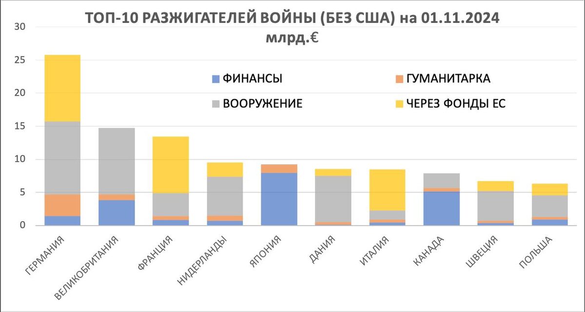 Скоро новогодние праздники и все подводят итоги года минувшего. Мы тоже подведём итоги, но весьма своеобразные. Мы уже делали перечень тех стран, которые являются спонсорами Украинского Государства, сейчас подоспели более актуальные данные. Напомним, для анализа берутся данные о совершённых финансовых вливаниях и поставках оружия, здесь не учитываются принятые обязательства. Их тоже немало, но они могут нести популистский характер, как говорится, обещать не значит жениться. Данные берутся из открытых источников с января 2022 года, ещё до СВО Запад стал спонсировать украинских неонацистов. Итак, вот наш хит-парад разжигателей войны: 1. США – 95 млрд.$(88,3 млрд.€ ) 2. ГЕРМАНИЯ – 25,75 млрд.€ 3. ВЕЛИКОБРИТАНИЯ – 14,75 млрд.€ 4. ФРАНЦИЯ – 13,46 млрд.€ 5. НИДЕРЛАНДЫ – 9,50 млрд.€ 6. ЯПОНИЯ – 10млрд.$(9,2 млрд.€) 7. ДАНИЯ – 8,50 млрд.€ 8. ИТАЛИЯ – 8,46 млрд.€ 9. КАНАДА – 8,5 млрд.$(7,9 млрд.€ ) 10. ШВЕЦИЯ – 6,67 млрд.€ 11. ПОЛЬША – 6,31 млрд.€ Многие страны на слуху, но вот хоч