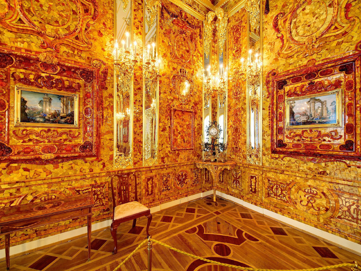 Янтарная комната (первоначально: Янтарный кабинет) - шедевр искусства XVIII века, бесследно исчезнувший во время Великой Отечественной войны. В отделке преимущественно использовался янтарь — большой кабинет состоял из янтарных панелей, украшений и панно. Создана немецкими мастерами для прусского короля Фридриха I, затем подарена Петру I, после чего дополнена зеркальными пилястрами под руководством Бартоломео Франческо Растрелли, так как размеры изначального янтарного кабинета были гораздо меньше того помещения, где она была выставлена в России. Считалась жемчужиной летней резиденции российских императоров в Царском Селе.