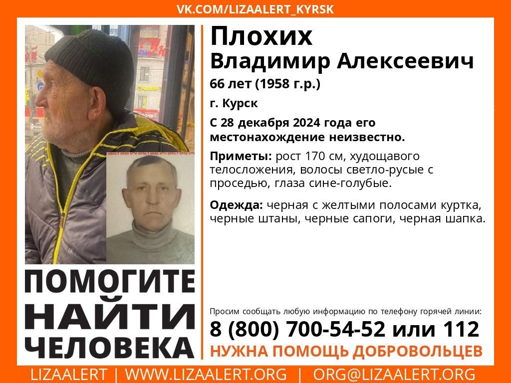 Волонтёры поисково-спасательного отряда «Лиза Алерт» ищут пропавшего 66-летнего Владимира Плохих. Местонахождение мужчины неизвестно с 28 декабря. Приметы пропавшего: рост 170 см, худощавого телосложения, светло-русые с проседью волосы, сине-голубые глаза. Был одет в чёрную куртку с желтыми полосками, чёрные куртку, сапоги и шапку. Любую информацию о местонахождении или передвижениях пенсионера поисковики просят сообщать по телефонам 8 (800) 700-54-52 или 112.
