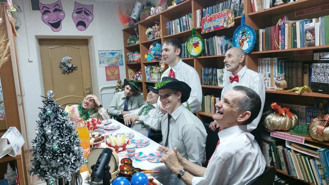 В рассказе координатора группы волонтеров Книжного клуба в Суровикинском ПНИ Евгении Селивановой много веселых смайлов. Видно, что она писала, вспоминала и улыбалась. Но когда мы получили от нее фотографии, то сами заулыбались до ушей. Такие они там все классные! «Наша предновогодняя встреча прошла мило, тепло и душевно, хотя перед самым началом встречи девочки-волонтеры отчего-то сильно волновались:) И было очень приятно видеть, как наши ребята нарядились, да и вообще выглядели отлично, были в хороше-веселом настроении и сидели за праздничным столом со вкусностями, которые им отправили «Даниловцы». К нам подключался Дед Мороз из Перми, который до последнего не мог решить, сможет он найти время и поздравить ребят или нет. Но чтобы не оставить ребят без поздравлений, Света, наш волонтер, договорилась со Снегурочкой, а она тоже пришла с Дедом Морозом! Поэтому в итоге нас поздравляли два Деда и одна Снегурка. Ко встрече мы приготовили для ребят две викторины. Одна была посвящена новогодне