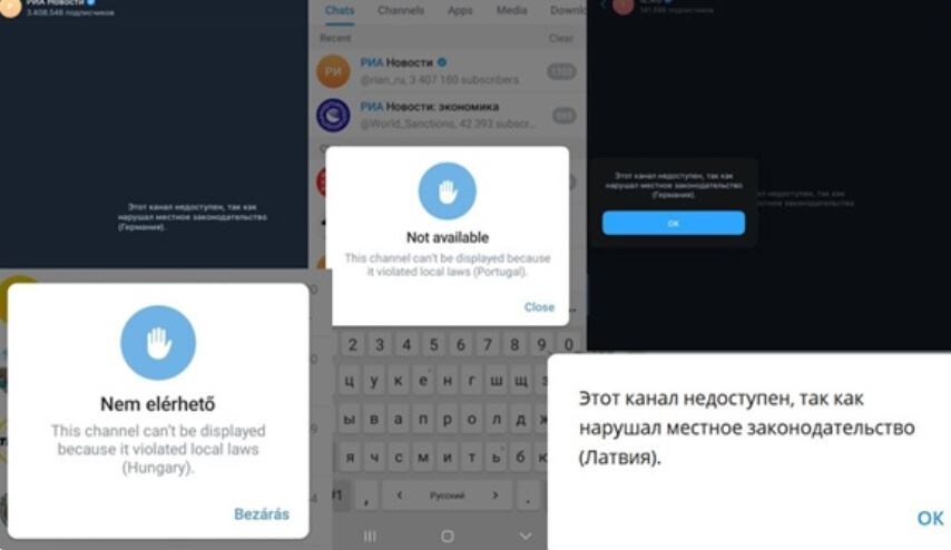 28 декабря европейских пользователей Telegram ждал сюрприз. Многие популярные российские каналы перестали открываться. При попытке войти появлялось сообщение: «Этот канал недоступен, так как нарушал местное законодательство». ВЕС были заблокированы Telegram-каналы крупнейших СМИ: РИА «Новости», «Известий», «Российской газеты», «Голоса Европы», RT. Под нож пошли адаптированные для мессенджера версии «Первого канала», телеканала «Россия 1», НТВ и других «кнопок». Недоступны для европейцев стали и некоторые блогеры.