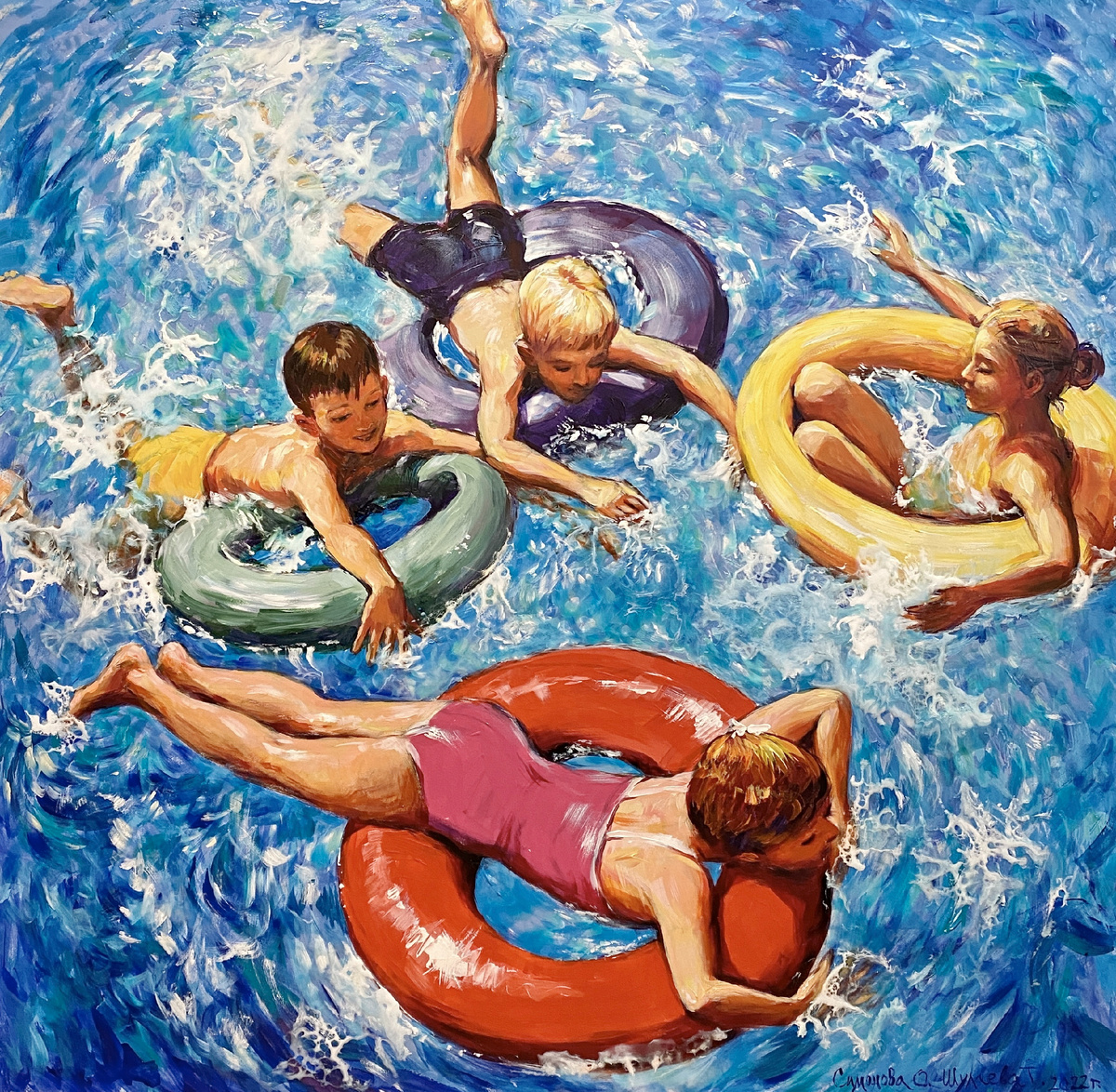 Ольга Симонова создала много детских портретов, и в этих её работах скрыта нежная грусть, напоминающая волшебный напиток из детства, запечатанный солнечным светом в хрустальном сосуде, и живущая в каждом из нас. Это тоска по ушедшему босоногому детству, по когда-то любимому домашнему питомцу, по теплой морской волне, мягко щекочущей ноги. Картины Ольги наполняют пространство позитивной энергией искренней молитвы и способствуют умиротворению. Пространство, где выставлены её работы, наполняется особым светом нежности и тепла, а также чем-то неуловимым, как аромат цветущего миндаля или согретого южной ночью абрикоса. Особенно интересны сюжеты «дети +море». Они привлекают передачей движения непоседливых шалунов, но в то же время композиционно выверены и гармоничны по цветовым решениям. К таким работам относятся «Лето» (2022) и «Прыжок» (2024). В картине «Лето», выполненной в смешанной технике акрила со смолой на МДФ, плавающие на разноцветных кругах девочки и мальчики образуют радостный хоровод счастливого детства. Состояние беззаботности и игривости ярко передано художницей в этом сюжете.