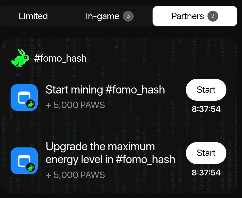 🍩 DONOT Не пропусти новый проект от 🐾PAWS и 🤑BLUM 30 декаюря в игре PAWS появилось 2 задания 1. Начать майнинг в игре FomoHash 2. Восстановить энергию за звёзды в игре #FomoHash Как решить второе задание в #PAWS без звёзд, смотри инструкцию в нашем Telegram-канале: ЖМИ СЮДА