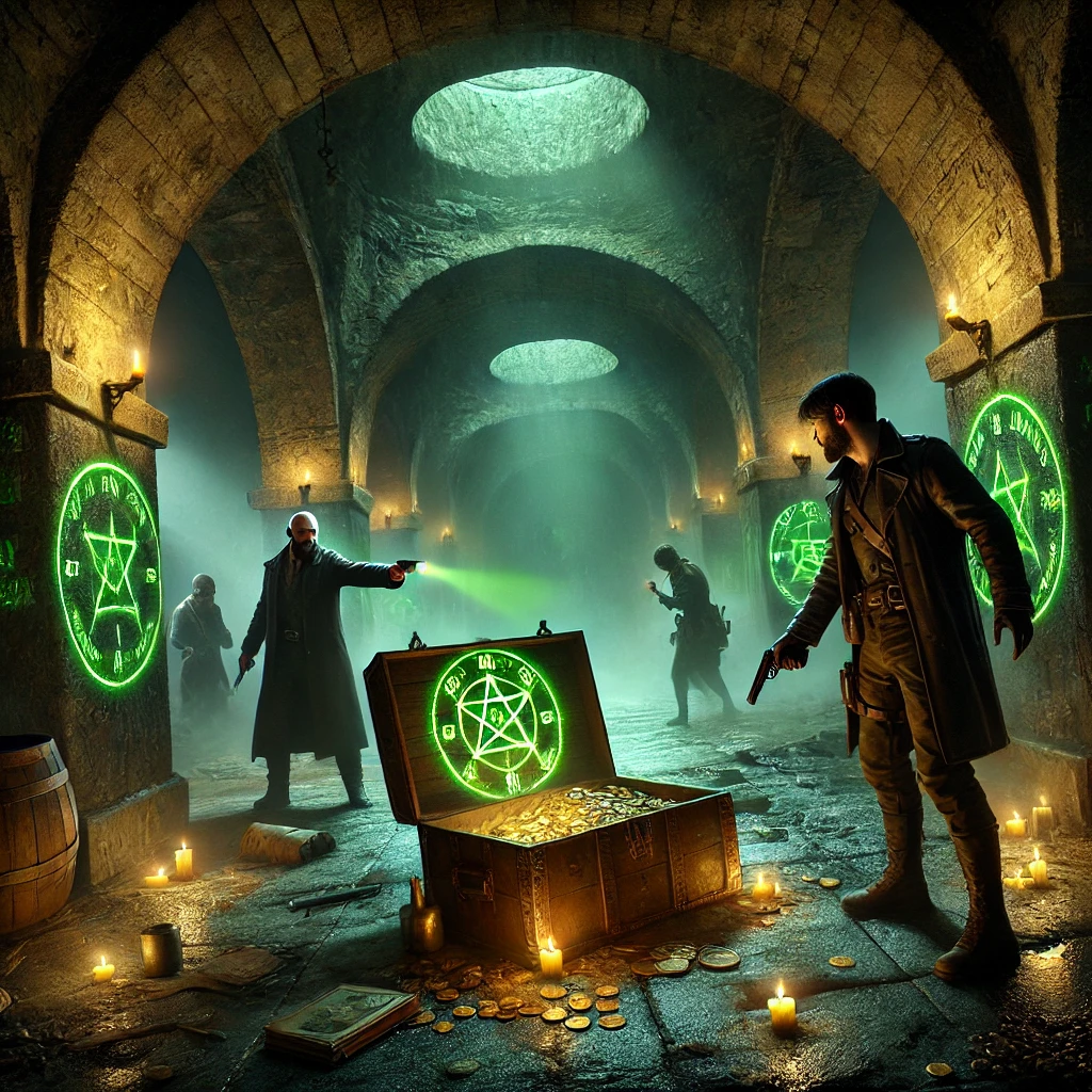 Сергей Климов внимательно посмотрел на содержимое ларца. Внутри находились не только старинные монеты и украшения, но и странный пергамент. Он был покрыт символами, которые выглядели как часть древнего шифра. — Это нельзя трогать! — резко остановил его Прудников, выхватывая пергамент. Но было уже поздно. Как только Климов прикоснулся к одному из символов, подземелье задрожало. Каменные стены начали медленно сдвигаться, как будто невидимый механизм пришёл в движение. В воздухе повис странный низкий гул. — Ты не понимаешь, что наделал! — закричал Прудников. — Этот пергамент — часть печати! Её нельзя было нарушать! Сергей, стараясь сохранять хладнокровие, осветил фонариком стены. Символы, покрывавшие их, начали светиться слабым зелёным светом. — Объясните мне, наконец, что здесь происходит! — потребовал Климов, чувствуя, как земля под ногами слегка вибрирует. Антон Семёнович выглядел сломленным. Его лицо побледнело, и он нервно теребил крест. — Этот монастырь был построен на месте древне