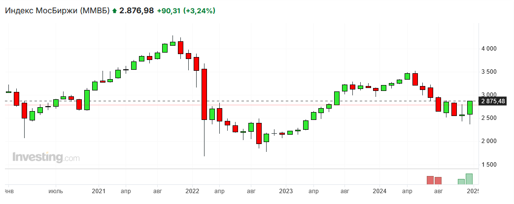 По итогам основной сессии индекс Московской биржи закрывает ростом более чем на 3% и закрывается выше 2875 пунктов.