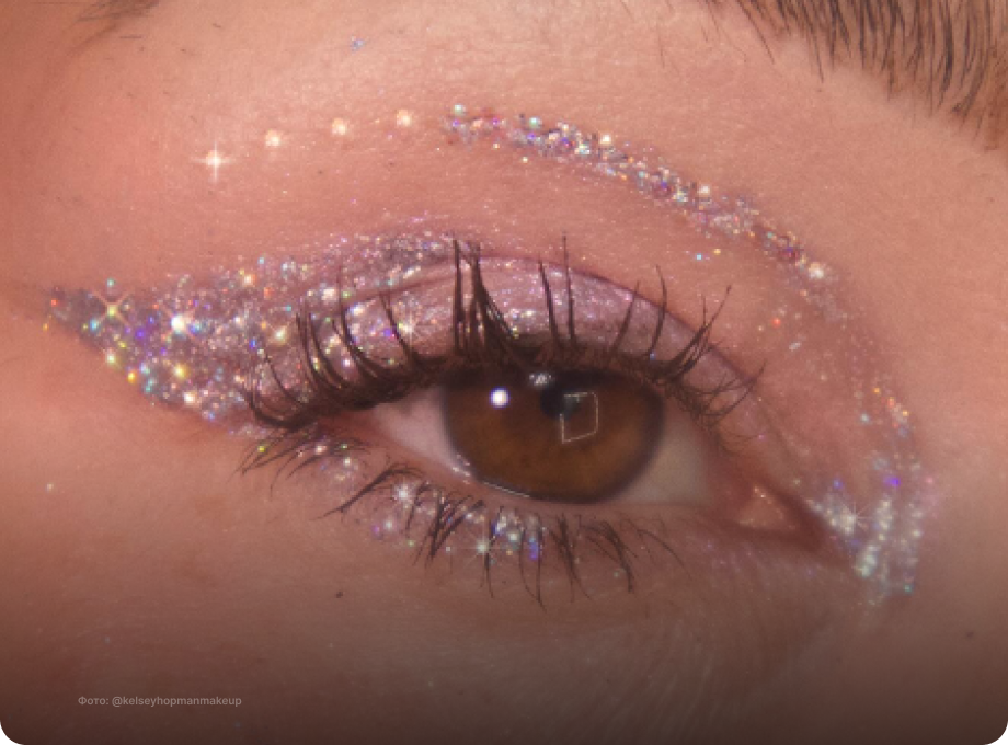 Глиттер состоит из блёсток одной или разной величины. Бывают средства с гелевой текстурой или сухие — кстати, для нанесения последних понадобится специальный клей. На праздничных вечеринках такие продукты просто незаменимы: нанеся глиттер всего лишь в одной зоне можно за несколько секунд сделать образ наряднее. Показываем пять нетривиальных способов применения сияшек. Познакомиться поближе с брендами из этой статьи и научиться делать макияж с блёстками можно на Московской неделе красоты, которая пройдёт с 26 по 29 декабря в Центральном выставочном зале «Манеж». Перед применением глиттера прочитайте, можно ли использовать его на глазах. Если да, то кистью в форме бочонка или кончиком мизинца добавьте немного продукта на внутренние уголки глаз. Это моментально сделает взгляд ярким и распахнутым. Остальной макияж глаз можно сделать в цвет блёсток или нюдовым, чтобы не смещать акцент. Нанесите немного глиттера на верхние точки скул. Делать это удобнее всего средством с мелким шиммером или