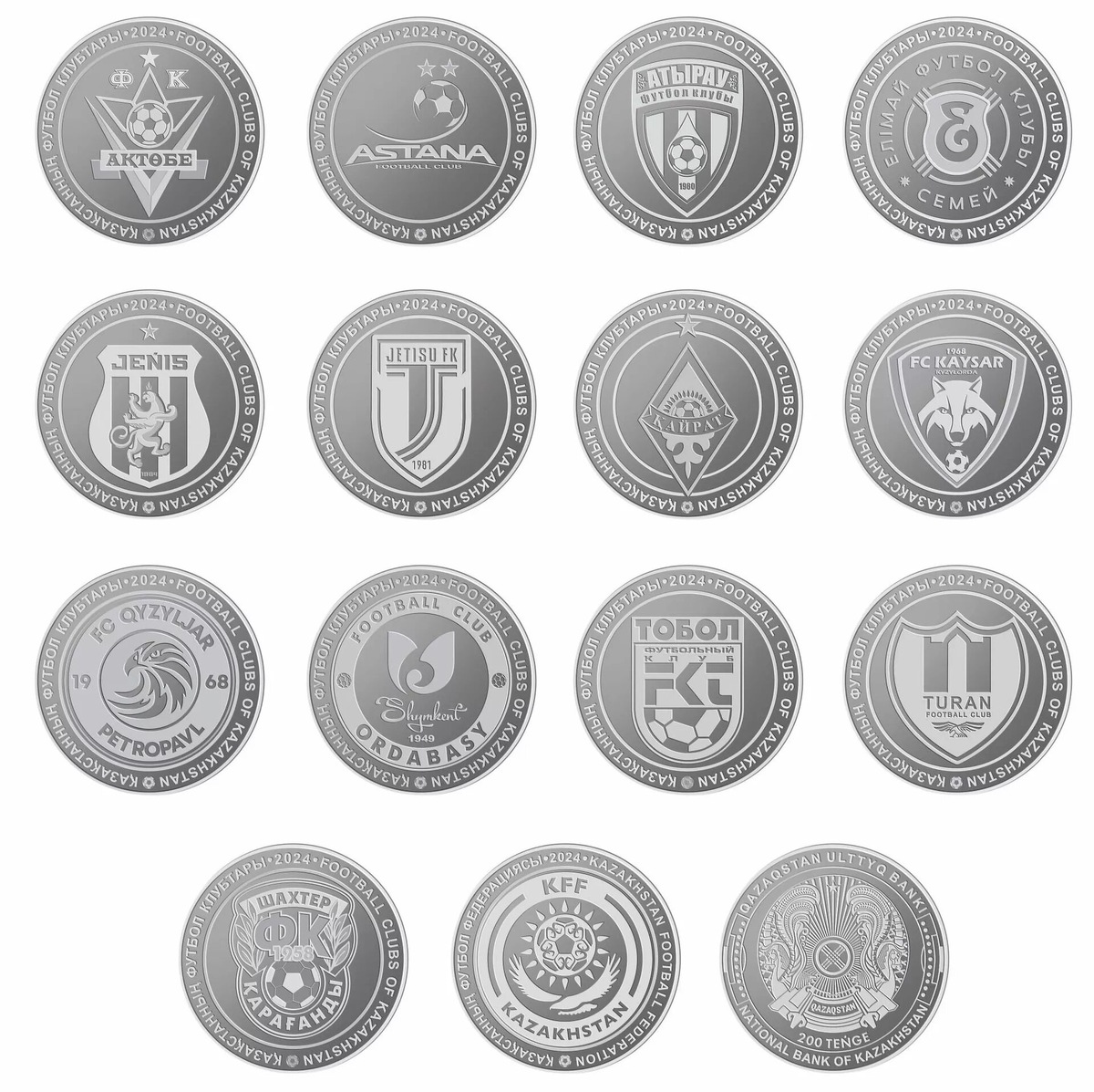 Пресс-служба Национального Банка Казахстана сообщила, что в обращение поступили 13 видов коллекционных монет «Казакстаннын футбол клубтары» и коллекционная монета «Казакстаннын футбол федерациясы» из серии «Спорт». На монетах «Казакстаннын футбол клубтары» изображены логотипы клубов Премьер-лиги Казахстана в текущем сезоне. Монеты будут изготовлены тиражом по 7 тысяч штук каждого вида, из которых 5 тысяч штук будут в индивидуальных блистерах и 2 тысячи монет каждого вида будут укомплектованы в сувенирный блистерный набор. Монеты изготовлены из сплава мельхиор массой 15 грамм, диаметром 33 мм, качеством изготовления brilliant uncirculated. Их номинал – 200 тенге. На монете «Казакстаннын футбол федерациясы» изображен логотип Казахстанской федерации футбола. Она будет изготовлена тиражом 2 000 штук и реализовываться в составе сувенирного блистерного набора «Казакстаннын футбол клубтары». Изображение: nationalbank.kz