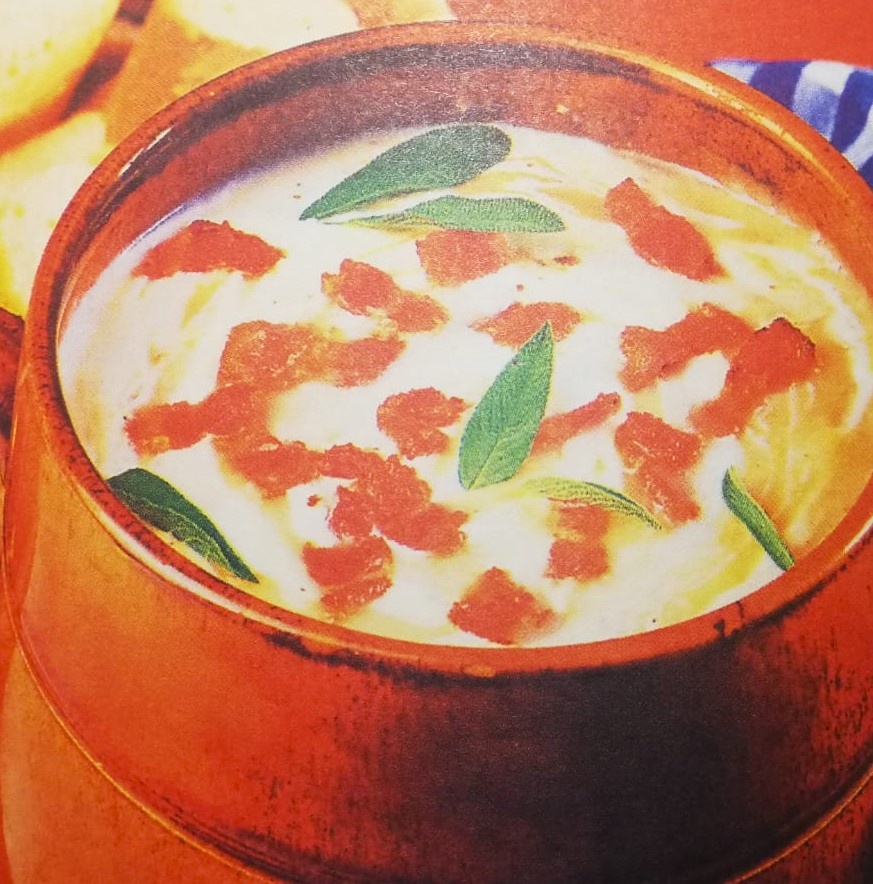 Слей воду с отваренного картофеля и фасоли, добавь их к смеси лука и бекона, положи веточку шалфея и залей бульоном. Доведи до кипения, убавь огонь и туши 10 минут, а потом взбей всё в блендере.