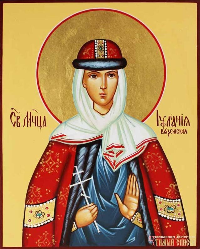 Эта святая была женой Вяземского князя Симеона Мстиславича. Смоленск был завоеван Литвой, и князя изгнали из родной земли. Великий князь Василий Московский дал город Торжок в удел князю Симеону совместно со Смоленским князем Юрием Святославовичем. Юрий сразу был поражен красотой Иулиании и стал склонять её к измене мужу. Но Иулиания отказала. Тогда князь, совсем лишившись рассудка, убил Симеона и пытался силой овладеть его женой. Иулиания убегала, но разъяренный князь бежал за ней, догнал, отрубил ей руки и ноги , а тело бросил в реку Тверцу. Произошло это в 1406 году. После этого князь не мог найти покоя и ушёл в монастырь, где провел 2 года в слезах и покаянии, после чего отошёл ко Господу. А весной 1407 года один крестьянин увидел плывшее по реке тело святой Иулиании. Он собрал духовенство и было устроено погребение тела. Во время этого тяжело больной мужчина внезапно исцелился. К мощам княгини стали приходить люди, прося помощи. В 1815 году старый Преображенский собор разбирали и с