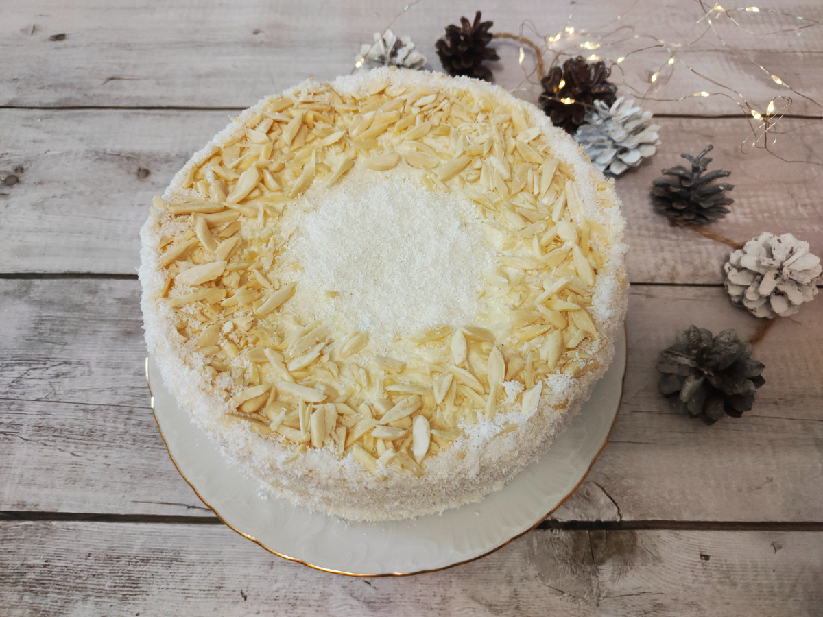 Невероятно нежный, вкусный и лёгкий торт с кокосом и миндальными орешками 🤤 Удачное сочетание коржей от всеми любимой "Молочной девочки" и сливочного творожного крема со взбитыми сливками. Добавление кокосовой стружки и миндаля придаёт удивительное сходство с популярными конфетами. Тем не менее, это один из самых простых в приготовлении тортов, и, что особенно приятно, для его приготовления совсем не понадобится масло. Тесто - - сгущённое молоко 1 банка 380 гр. - яйца СО 2 шт. - мука в/с 150 гр. - разрыхлитель 10 гр. Крем - - сливки для взбивания 250 мл - творожный сливочный сыр 400 гр. - сахарная пудра 100 гр. - белый шоколад 100 гр. - кокосовая стружка 50 гр. - миндаль не жареный 50 гр. - экстракт ванили 1 ч.ложка Для украшения: - кокосовая стружка - миндаль Выливаем в миску сгущёнку и разбиваем 2 крупных яйца: Взбиваем до однородной массы и добавляем муку, уже смешанную с разрыхлителем: Тесто готово. По виду и по густоте оно напоминает ту же сгущёнку: 🔥Включаем духовку