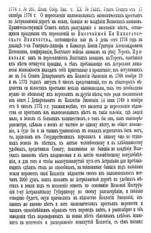 Приказали: как переселением Волгских казаков на реку Терек нынешние их места останутся праздны, а тем проезжающие из Астрахани лишаются возможности находить себе пристанище и пропитание …. Необходимо нужно по нескольку их переселить на другие места, чего ради посланными из онаго I Департамента в Коллегию Экономии 14 июня 1769 и ноября 18 и в 1772 г.г. указами ВЕЛЕНО…из Государственных порозжих и никому еще не отданных земель в местах к житию человеческому и к хлебопашеству удобных, представила Сенату. Показанные же бывшие владения Волгских казаков плодоносные и к житию человеческому наудобнейшие и для того и чтобы вышеупомянутый путь от Астрахани для проезжающих сделать столь же способным, на показанныя бывшие под казаками земли перевести оной Коллегии ведомства своего из малоземельных вотчин 2000 душ, коих поселить по Астраханской дороги в удобных местах и земли под то поселение отвесть на основании Межевой инструкции … оную (землю) причислить в ведомство Коллегии Экономии. (Лит.6)