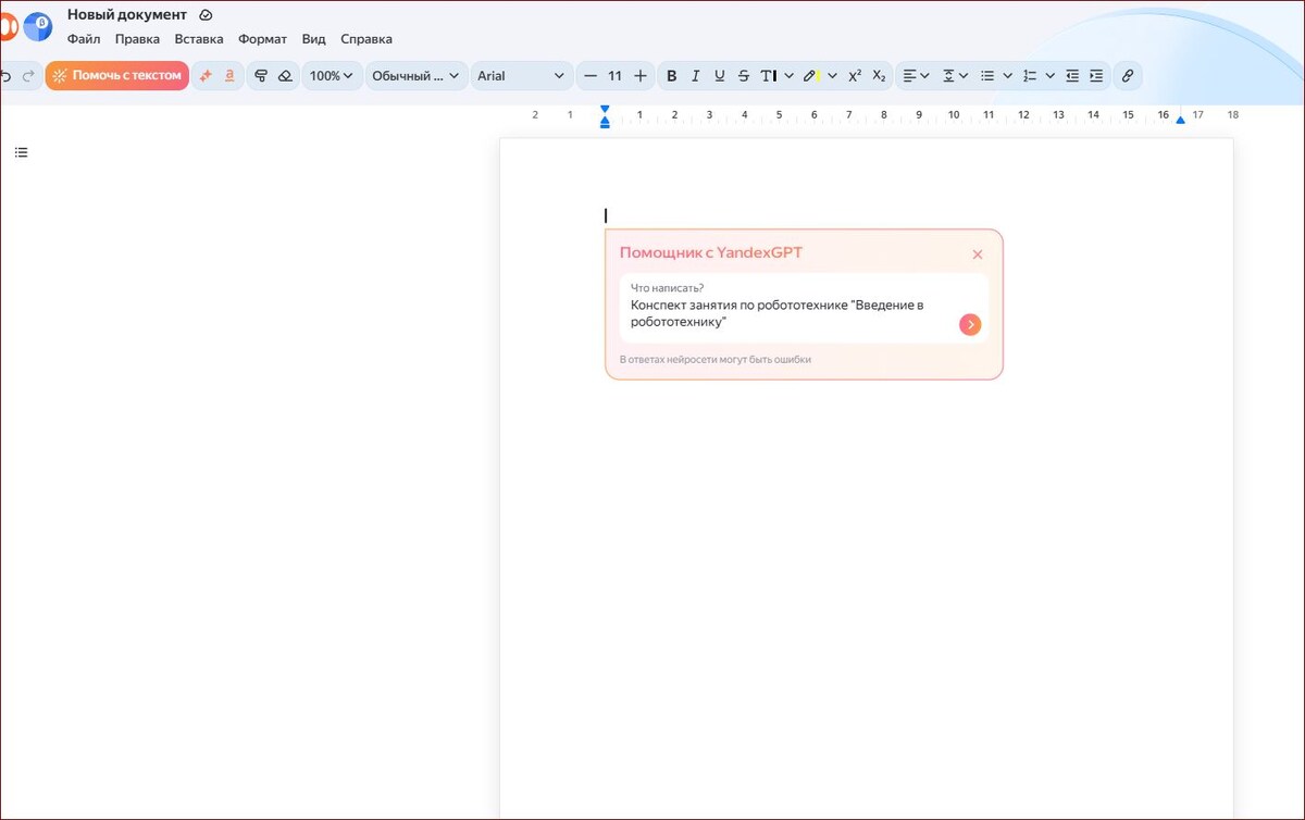 Приветствую дорогой читатель. Яндекс документы всегда были в наборе моих инструментов для взаимодействия с педагогами, сбора информации, создания онлайн мероприятий и т.п. Использование данного сервиса в своей работе создаёт очень большое удобство. Сейчас в яндекс документах проходит обновление, как я понял оно было запущенно ещё 15 декабря, что же поменялось в этом сервисе. Поменялся внешний интерфейс документов, таблиц, презентация осталась прежней. По сути яндекс документы это Р7-Офис только онлайн, но теперь в документах и таблицах прошли большие изменения не только в интерфейсе но и наборе инструментов, как на пример в документах дополнилась функция «Помощник с текстом» нейросеть по вашем промтам создаёт необходимый вам текст. Для примера создал промт ( конспект занятия по робототехнике, тема Введение в робототехнику) Результат. В принципе, нормально. Давайте сравним как было и как стало. Редактор таблиц, какой был. Стал таким. В новом дизайне ещё нужно разбираться, к примеру я н