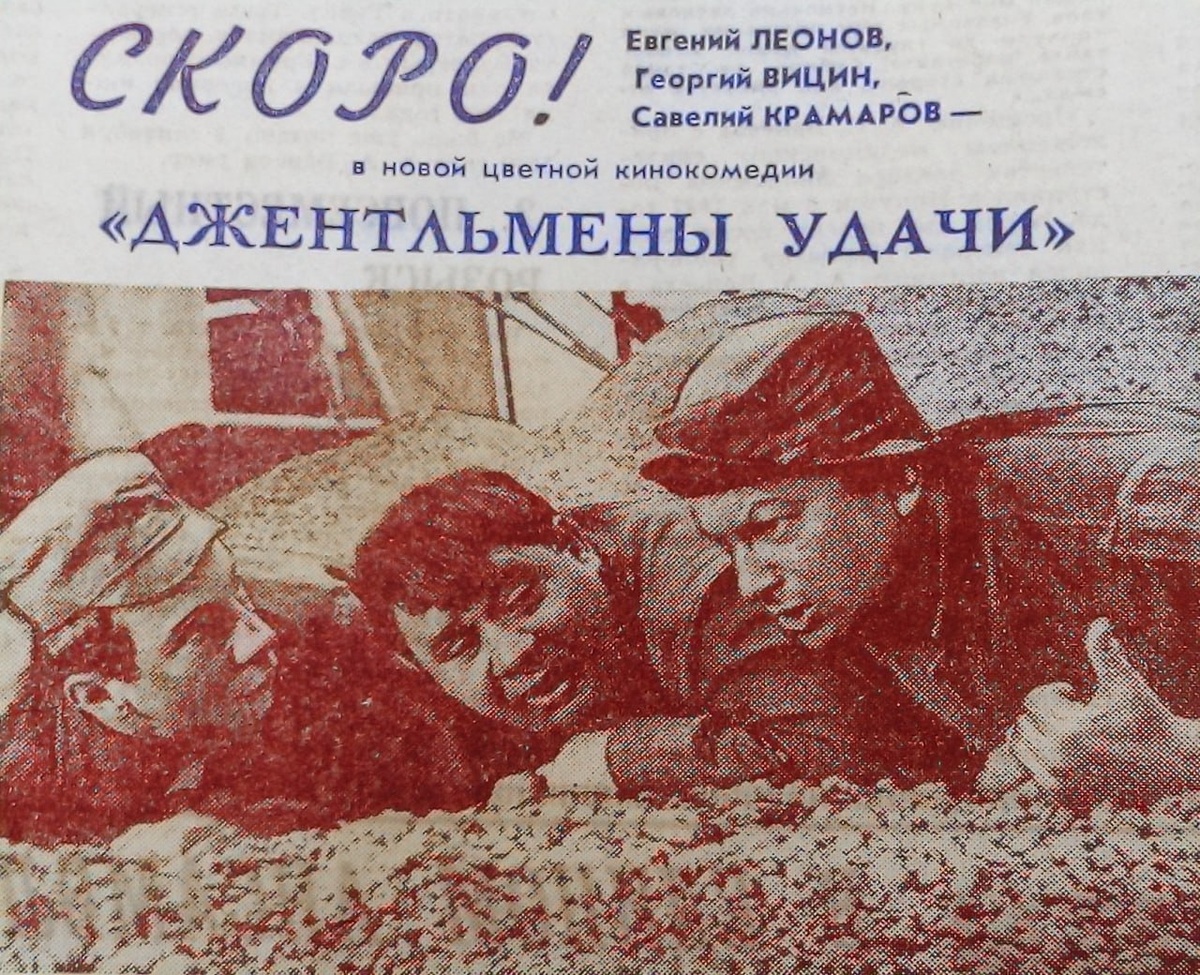Привычных ныне рекламных трейлеров будущих новинок в те годы не было, большинство людей узнавали о них из рубрики «Кинопремьеры» в газетах. Незадолго до начала проката «Джентльменов удачи» там был напечатан короткий обзор фильма, фактически описывавший завязку сюжета. Вы удивитесь, но его содержание имело мало общего с тем, что граждане в реальности увидели на экранах: «Стояла ночь. Над пустыней взошла луна. Возле входа в древнюю усыпальницу дежурил сторож. За его спиной послышался шорох. Старик обернулся, но не успел ничего увидеть, потому что его схватили, повалили, связали, заснули в рот кляп. Жулики вступили в усыпальницу. Жидкий свет фонаря выхватил из темноты каменный свод, гробницу, дощатый стол. В углу – железный ящик. «Доцент» достал из кармана связку отмычек, покопался в замке, и дверца ящика распахнулась. Тускло блеснул золотом древний боевой шлем, кольца, монеты. Так у археологической экспедиции №13, руководимой профессором Мальцевым, был похищен уникальный шлем Александра Македонского. Профессор Мальцев, случайно видевший и запомнивший жуликов, неожиданно встретил одного из них в троллейбусе в Москве. По его мнению, это главарь шайки по кличке «Доцент». Преследуя его, профессор приходит к детскому саду…»