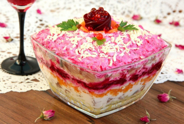 - 7-м слоем идет свекла, которая затем смазывается майонезом. Если салатник у вас высокий, повторите все слои. Но верхний слой всегда будет свекла и майонез. Слои аккуратно разровняйте. Когда все слои у вас будут выложены в салатник (их толщину выбирайте сами), закройте посуду пищевой пленкой и поставьте в холодильник для пропитки на 1-2 часа, лучше на ночь. Перед подачей можете натереть сверху вареный желток, посыпать зеленью.