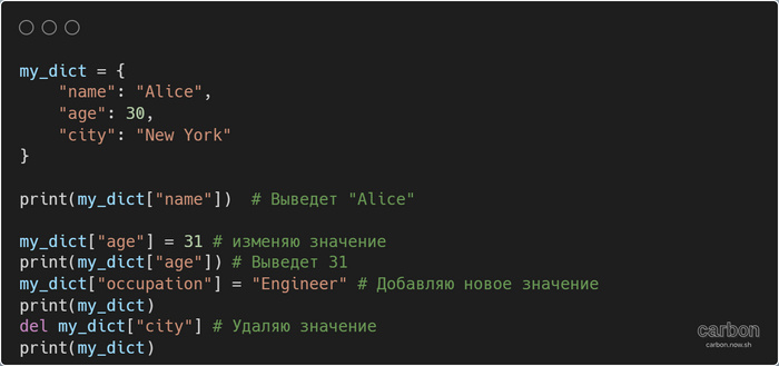 и многие другие. - Динамическое создание: Словари можно легко расширять, добавляя новые пары "ключ-значение" во время выполнения программы.