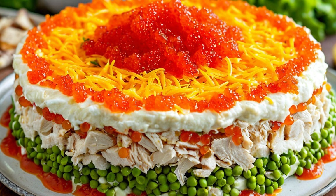 Ингредиенты: Приготовление: Сверху аккуратно распределите красную икру. Это придаст салату изысканный вид и неповторимый вкус. Можно чередовать слои по своему вкусу. Поместите салат в холодильник на 1-2 часа, чтобы он пропитался и охладился. Перед подачей на стол аккуратно снимите разъемное кольцо, если вы его использовали. Украсьте салат свежей зеленью, а также добавьте несколько ложек красной икры сверху для эффектного завершения. Салат «Царский» будет не только пищей, но и зрелищем, которое привнесет праздничное настроение на ваш новогодний стол. Приятного аппетита!