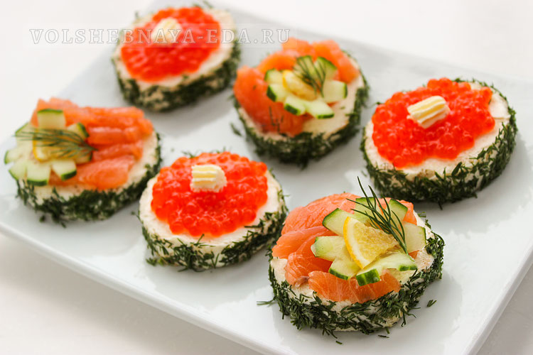 Какой же праздничный стол без бутербродов с икрой и красной рыбой? Рецепт новогодний и для других праздников. Багет нарезаем кружочками, смазываем маслом (или крем-сыром), обваливаем в укропе и подаем с икрой и красной рыбкой. Вкусно и нарядно. Такую закуску гости точно съедят первой! Кстати! Лосося, семгу или форель можно засолить самостоятельно — на сайте есть несколько очень хороших рецептов, классический, с апельсинами или свекольный гравлакс. Красную икру тоже можно солить в домашних условиях. Совет! Если хотите сэкономить, воспользуйтесь одной хитростью: возьмите баночку имитированной (белковой) икры и смешайте ее с натуральной красной икрой — вы получите вкусный продукт, из которого можно сделать очень много бутербродов для гостей. Багет (или белый батон) нарезать ломтиками, а затем с помощью вырубки сделать круглые заготовки. Если специальной вырубки у вас нет, то возьмите стакан или чашку. Обрезки можно пустить на панировочные сухари. Сливочное масло надо заранее достать из