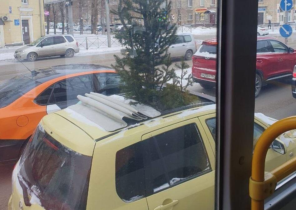 Житель Новосибирска удивил необычным способом перевозки ёлки в машине