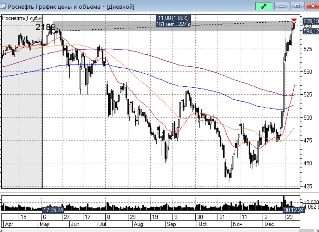 Оказалось, что сделка с префами Сургутнефтегаза оказалась не последней в этом году. Сегодня рынок начал новогоднее ралли, правда как-то поздно. В итоге зафиксировали профит по акциям Роснефти в размере 1,8%. В бумаге сидели долго, в том числе получили полугодовые дивиденды. У Роснефти 9 января дивидендная отсечка, будем подбирать бумагу на гэпе.