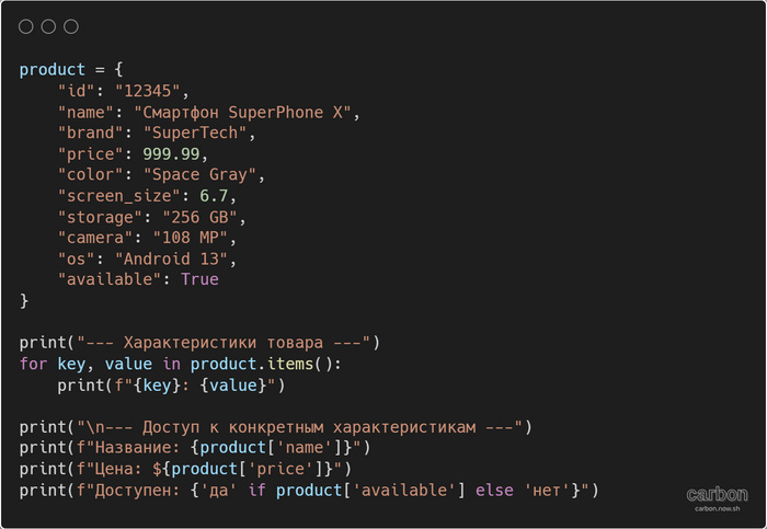 Структуры данных в python Примеры использования списков и словарей для представления данных о товарах. Я разложу абстрактный товар по характеристикам и покажу, как использовать список для представления товаров в категории. Словарь для представления характеристик одного товара. В этом случае, ключами словаря будут названия характеристик, а значениями – их соответствующие значения. Разъяснение кода: Список для представления списка товаров в определенной категории. В этом случае, каждый элемент списка будет представлять отдельный товар, который, в свою очередь, может быть представлен словарем. Разъяснение кода: Оригинал статьи в GIT Другие шпаргалки Канал: 101 игра на python