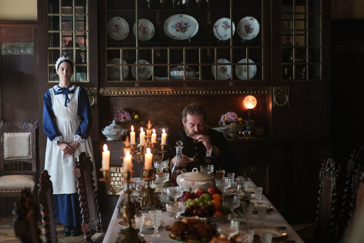 Даже немного жаль, что «Купцы и дети» выходят не в новогодние праздники, потому что антураж в начале сериала соответствующий. 1910 год, дом купца Намолина (Михаил Пореченков) готовится ко встрече Рождества и приезду из Петербурга сына-студента. Купеческое поместье украшено гирляндами, а на праздничный стол припасли самые разнообразные блюда – тут и запеченный поросенок, и стерлядь, и множество изысканных закусок. Наступающий праздник не омрачает даже случайно упавшая бочка с красной икрой, хотя, как потом станет понятно, с маленьких огорчений начинаются большие беды. Недаром Марфа Сергеевна Намолина (Ксения Кутепова) отчаянно верит в гороскопы и даже собирается встречать Новый год в простом платье своей горничной, за которой ухлестывает сам Федор Иванович Намолин. Несмотря на следование приметам, рождество оказывается под угрозой, когда некогда послушный сын привозит в купеческий дом своих друзей-революционеров. Табаков на страже революции