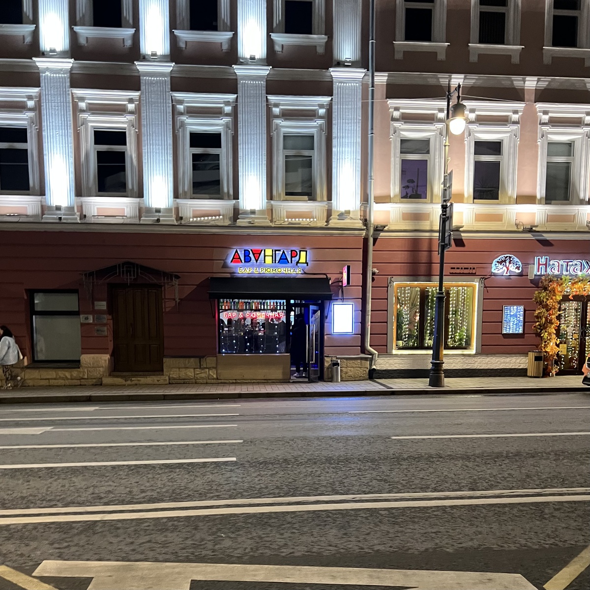 Лекции под водочку, барды под селедочку и шахматы под настойки для полного позитива в писательской компании «Авангарда», не самой притягательной или вкусной рюмочной в городе. Интерьер простой, но без мусора и грязи. Меню базовое, недорогое, народное. Еда очень похожа на то, что выдавали в пивных, рюмочных и закусочных во времена застойного Советского Союза, и требует дополнительного внимания со стороны кухни. Настойки – главная достопримечательность, водочка идет вторым успешным номером. А если так, то после них кто уже разберет, что там на досках и в тарелках?