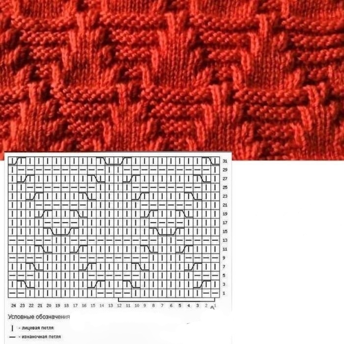 Необычная пышная резинка спицами Раппорт 3 п. и 2 ряда Поворотное вязание (+1 п. симметрии + 2 кром.): 1 ряд: кром., 1 изн.п., *2 вместе л.п. скрещ., затем первую из этих п. провязать так же л.п. скрещ., 1 изн.п.*, кром.; 2 ряд: кром., *2 л.п., 1 п. переснять, не провязывая, при этом нить перед работой;* 1 л.п., кром. Повторять 1-2 ряды Вязание по кругу (+1 п. для замыкания в круг): 1 ряд: *2 вместе л.п. скрещ., затем первую из этих п. провязать так же л.п. скрещ., 1 изн.п.*; 2 ряд: *1 п. переснять, не провязывая, при этом нить за работой, 2 изн.п.* Повторять 1-2 ряды Рельефный узор спицами из объёмных дорожек Раппорт 8 п. (+2 кром. + 5 п. симметрии) и 8 рядов Поворотное вязание: 1 ряд: *2 изн, 1 петлю переснять - нить за работой, 2 изн, 3 лиц,* 2 изн, 1 петлю переснять - нить за работой, 2 изн. 2, 4, 8 ряды: изнаночные петли. 3 ряд: *2 изн, 1 петлю переснять - нить за работой, 2 изн, 3 лиц,* 2 изн, 1 петлю переснять - нить за работой, 2 изн. (как 1й) 5 ряд: *2 изн