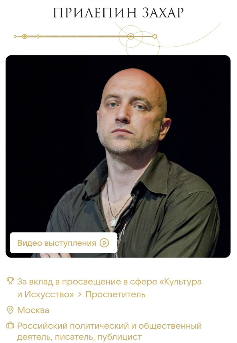 Источник: Ваши Новости 110 человек вошли в шорт-лист спецноминации «Народный выбор». В том числе за вклад в просвещение в сфере культуры и искусства номинирован писатель Захар Прилепин. Проголосовать можно по ссылке. Его конкурентами в этой номинации стали худрук Нового театра Эдуард Бояков, худрук Московского театра поэтов Владислав Маленко и худрук Театра Олега Табакова Владимир Машков. Всего в премии представлено 15 номинаций. Проголосовать по каждой из номинаций можно в мини-приложении в ВК по ссылке: https://vk.com/premiya_znanierussia