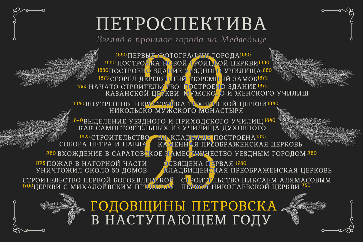 Сейчас к нам приближается Новый, 2025-ый год. Предлагаю посмотреть, какие же годовщины для города на Медведице ждут нас в новом году. Для себя я отметил, что в 2025 году много дат касающихся постройки или освящения утраченных храмов, некоторые храмы попадают в "круглые даты" даже несколько раз.