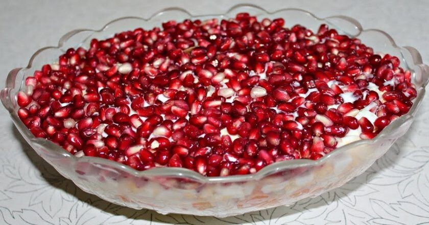 Салат «Капли страсти» с языком — нарядный, сытный и вкусный праздничный салат. Ингредиенты: Приготовление: Репчатый лук нарезать кольцами и замариновать в смеси оливкового или растительного масла и уксуса, выдерживать около 30 минут, затем лук промыть и просушить. Картофель, яйца натереть на тёрке. Отварной язык нарезать соломкой. Выложить салат слоями: картофель, залить майонезом; затем выложить язык, залить майонезом; выложить лук, залить майонезом; яйца, залить майонезом; сверху посыпать всё тёртым сыром, залить майонезом. На поверхности салата разложить зёрна граната. Перед подачей дать салату настояться 2–3 часа в холодильнике. Приятного аппетита!