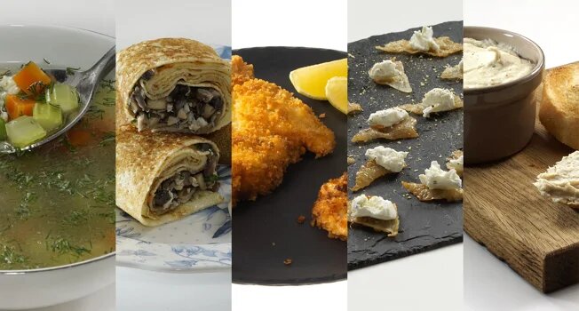 Большой красивый обед с супом, блинами, закусками и шницелем — и все из одной курицы