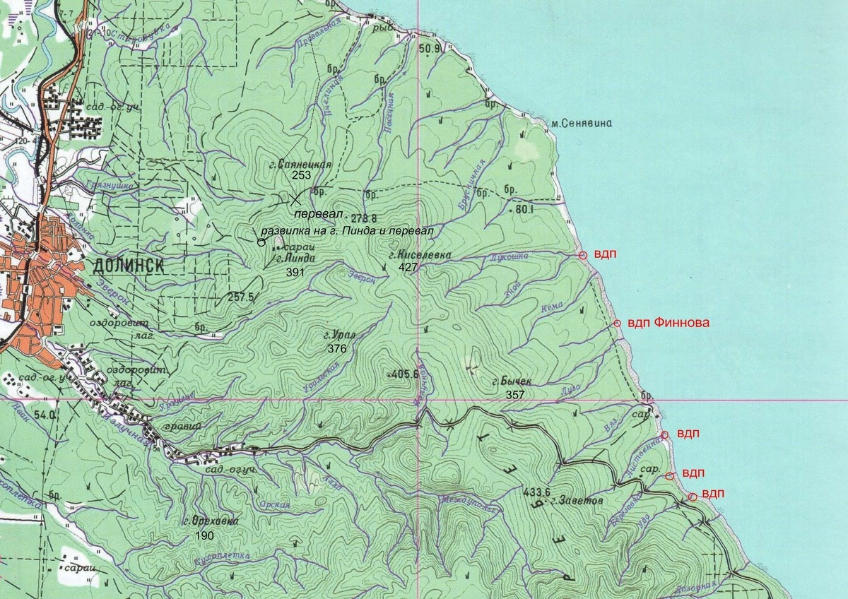 На многих картах, даже старых 2-километровках (т.е. масштаб в 1 см 2 км), с упоминавшегося выше перевала высотой 205 м над уровнем моря показана дорожка на восток, выводящая на побережье Охотского моря уже в 1,5 км южнее мыса Сенявина. Всего путь из Долинска на побережье таким путём составляет 13 км.