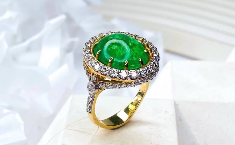 В центре украшения – крупный изумруд весом 5,45 карата, прочно закрепленный золотыми крапанами. Вокруг камня расположились натуральные бриллианты круглой огранки, которые придают дополнительный блеск и магическое сияние. Шинка кольца тоже необычная, она сужается к центру и также декорирована бриллиантами. Центральный камень приподнят над поверхностью изделия, что придает ему легкость и воздушность.