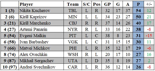 Впервые за последние 5 недель поменялась тройка лидеров среди наших бомбардиров. Кирилл Марченко набрал 5 очков в последних 3 матчах и ворвался в тройку лидеров, которая выглядит следующим образом: Никита Кучеров 54 (17+37) очка в 32 матчах, Кирилл Капризов 50 (23+27) очков в 34 матчах и Кирилл Марченко 40 (14+26) очков в 37 матчах.
