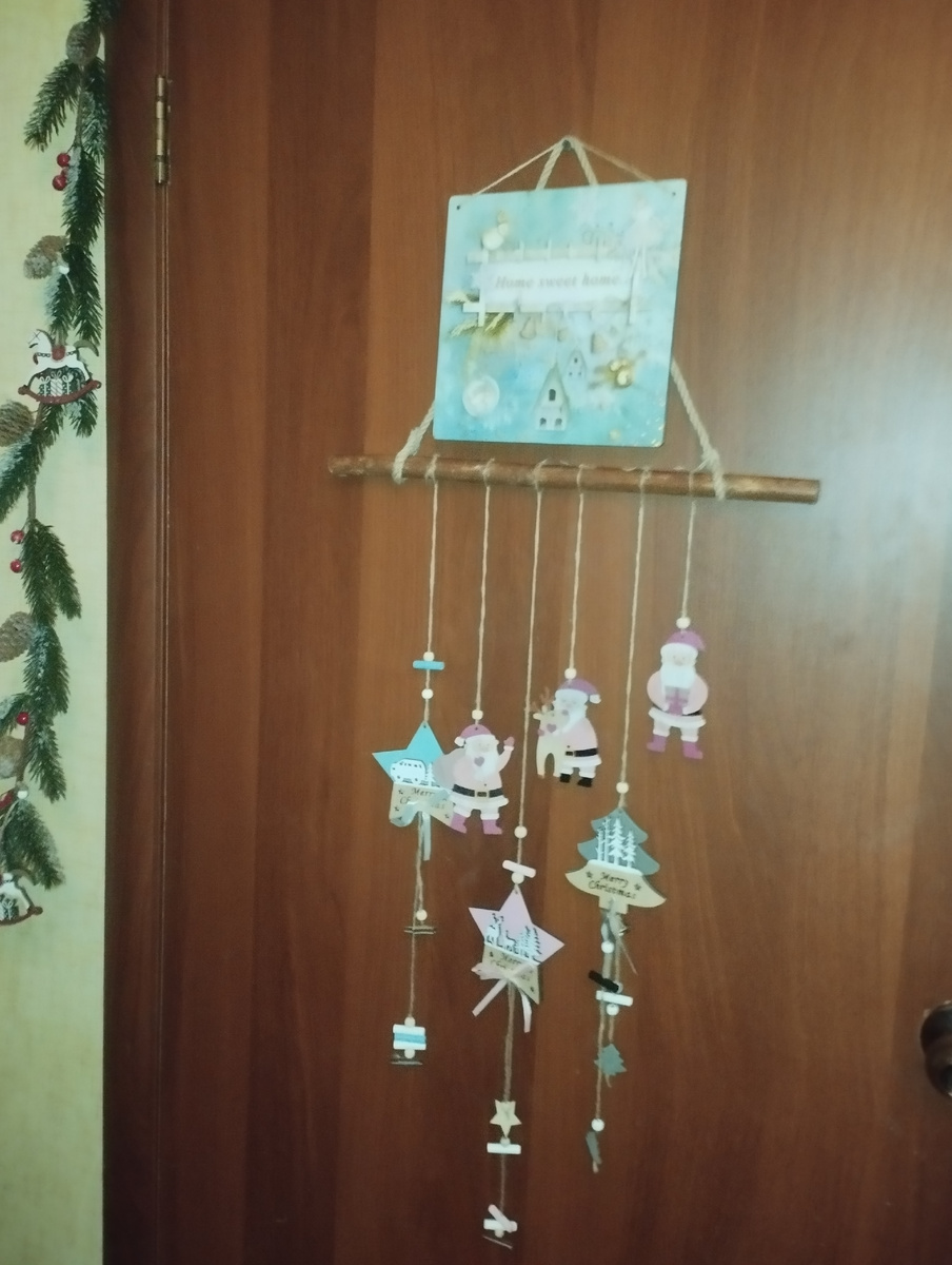 Праздник начинается с прихожей. Композию с деревянными подвесами повторила с прошлого года. Очень легко делается из деревянных игрушек, которых сейчас много продается во всех магазинах.