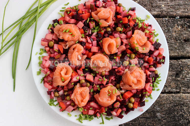 Как вы считаете, винегрет можно включить в праздничное меню? Или это блюдо слишком обыденное? А вы попробуйте добавить в него малосольную красную рыбу — от такого салата не откажется ни один гость! Винегрет с семгой готовится так же просто, как и классический. Главное — отварить заранее овощи и засолить рыбу. Можно использовать семгу, лосося, форель и прочие виды красной рыбы. Состав винегрета традиционный: свекла, морковь, картофель, бочковые огурцы и зеленый горошек. Для заправки предлагаю использовать лук, смешанный с винным уксусом и салатным маслом, чтобы добавить аромата. Красную рыбу вы можете покрошить в салат, а можете выложить сверху, скрутив в виде розочек — это придаст блюду праздничности. Общее время: 30 минут | Время приготовления: 15 минут
