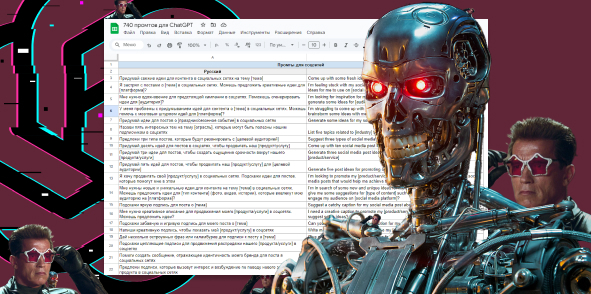 Собрал почти восемь сотен промтов для ChatGPT. Это вроде как самая большая подборка в Рунете. Подборка больше как образец подойдет. Затем надо заточить промт под свои задачи и стиль.