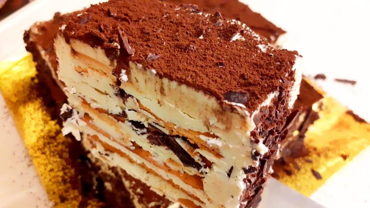 При помощи сита, дополнительно обсыпаю верх торт какао порошком. Вот такой простой и в то же время вкусный торт без выпечки у меня получился.