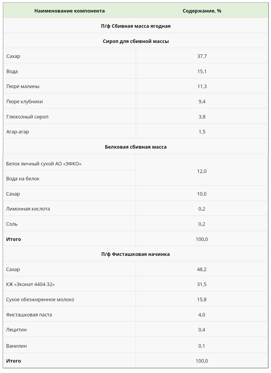 Предлагаем рассмотреть технологию производства зефира с жировой начинкой на примере вкусового сочетания «Малина-фисташка». Подробная рецептура представлена в Таблице 1.