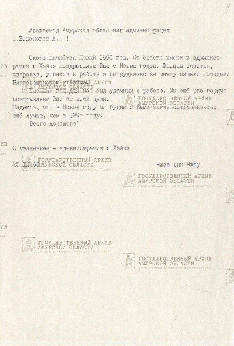 Поздравления прислала администрация соседнего города Хэйхэ. Государственный архив Амурской области в преддверии Нового года опубликовал поздравление, адресованное 29 лет назад. Послание отправили из Китая в Благовещенск. Слова в адрес "уважаемой Амурской областной администрации" в лице т. Белоногова А.Н. от "администрации г. Хэйхэ, Чжао вын Чжоу" приводятся в оригинале и с переводом. "Скоро начнется Новый 1996 год. От своего имени и администрации г. Хэйхэ поздравляем Вас с Новым годом. Желаем счастья, здоровья, успехов в работе и сотрудничестве между нашими городами Благовещенском и Хэйхэ. Прошлый год для нас был удачным в работе <...> Надеюсь, что в Новом году мы будем с Вами также сотрудничать, ещё лучше, чем в 1995 году", - говорится в поздравлении. Фото t.me/amurarhivRU Читать на сайте ТЕЛЕПОРТ.РФ Еще больше новостей в нашем телеграм-канале https://t.me/amurobl