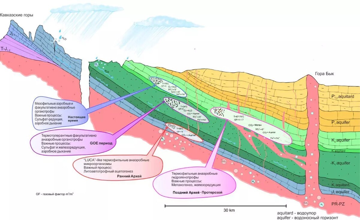 Исследователи из ФИЦ Биотехнологии РАН и МГУ изучили микробное сообщество ессентукских минеральных вод и сделали важное открытие. На глубине около километра ученые обнаружили бактерии, которые по своему способу питания схожи с последним общим предком всех живых организмов — LUCA. Это делает ессентукские воды уникальной моделью древней экосистемы нашей планеты. На основе изучения трех водоносных горизонтов, возраст которых сопоставим с эрой динозавров, ученые утверждают, что условия под землей остаются стабильными и не подвержены быстрым изменениям, характерным для поверхностной среды. Благодаря этому, подземные микроорганизмы медленно эволюционируют, сохраняя черты самых ранних обитателей Земли. В глубоких горизонтах ученые обнаружили ацетогенные бактерии, которые используют в качестве источника энергии углекислый газ и водород — такие же механизмы питания предположительно использовал LUCA. В других горизонтах встречаются также древние археи, не поддающиеся культивированию в лабораторн