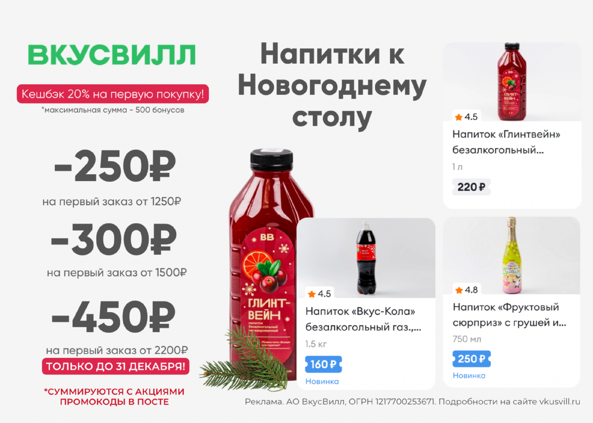 Каким бы разнообразным ни было меню для праздничного стола, оно не обойдется без любимых напитков. И это не только алкоголь! Проверьте свои запасы соков и газировки. Сейчас есть возможность выгодно все купить во ВкусВилл не выходя из дома!