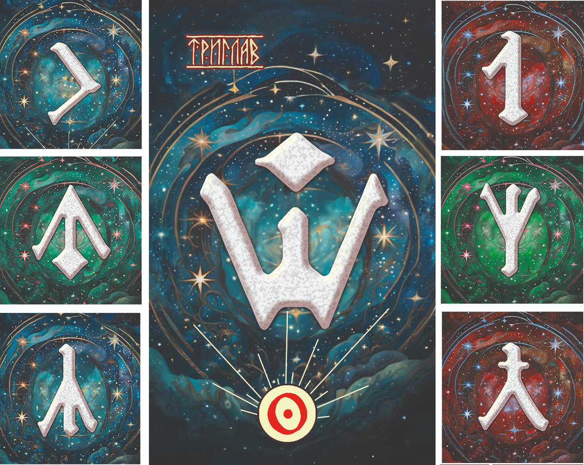 В Издательстве "Фаир". Вышла колода карт и книга "Руны Древней Руси". Продолжаем презентацию планетарной серией. Теперь поговорим о руне Вселенной: о руне Триглав. Ключевые понятия: Правь. Вышний. Алатырь. «Аз есмь альфа и омега». Мантическое значение: Это руна Прави. Выбор её означает то, что вы находитесь под самым высоким покровительством. И на вас лежит высшая ответственность. Вы идёте по Стезе Прави. На ваш вопрос дан ответ «да». Вы вызвали к себе интерес со стороны высшей иерархии. При Рождении Мира, Бог назвал произнёс: ОУМ (ОУМ). Потому к сему знаку близки также руны (О-У-М), либо (А-У-М). Руна являет знак Бога-Троицы (сравни с цифрой 3). От неё произошли знаки у многих народов с тем же смыслом (сравни христианскую-арианскую, исламскую и индийскую традиции). ОУМ (АУМ) — первый звук, произнесённый при Творении. Также этот звук обозначают буквой (азъ) или (альфа). Этот знак присутствует в рассмотренном выше символе Прави). Сия буква (руна) занимает первое место во многих а